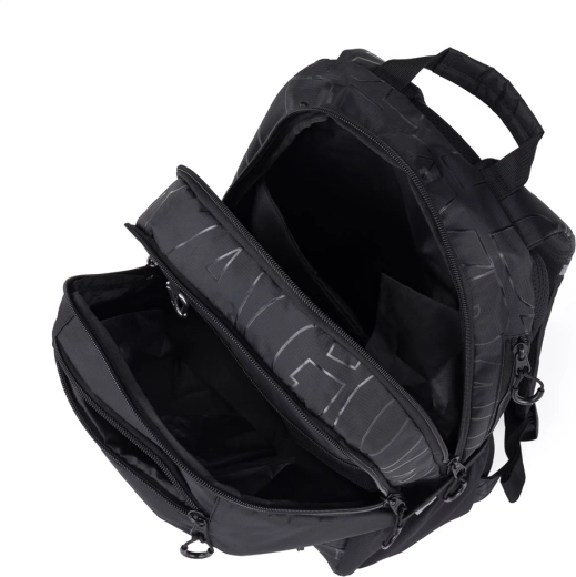 - 2 pagrindinės kameros, priekinė kišenė, sutvirtinta nešiojamojo kompiuterio kišenė, kišenė smulkmenoms, karabinas raktams, paslėpta kišenė nugarėlėje, šoninė kišenė buteliui