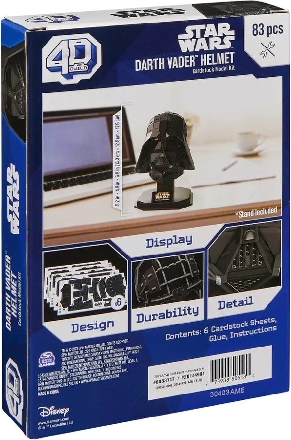 Pastatykite ikoninio tamsos lordo iš STAR WARS sagos šalmą kaip stilingą 4D modelį. Rinkinyje yra 83 išimami detalių ant 6 lakštų, klijai, stovas ir aiški instrukcija – be įrankių. Baigto modelio matmenys 13,3 × 12,5 × 17,6 cm – puiki dekoracija miegamajam, žaidimų kambariui ar darbo stalui ir idealus dovana gerbėjams nuo maždaug 14 metų.