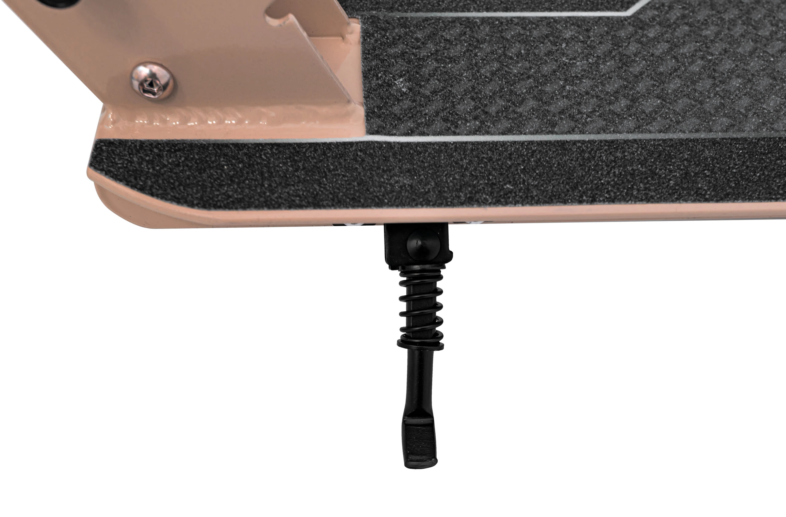 Saugumas jūsų rankose: rankinis diskinis stabdys ir galinis pakojinis stabdys suteikia užtikrintą ir greitą sustojimą. Guminiai ratai 190 × 35 mm puikiai slopina smulkius nelygumus, o neslystantis paviršius laiko koją net ir šlapiu oru. Taip pat yra kojelė patogiam pastatymui.