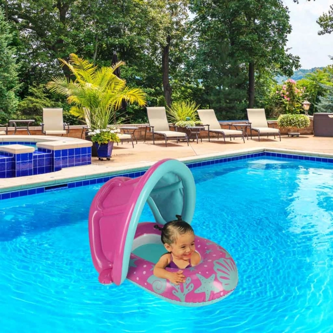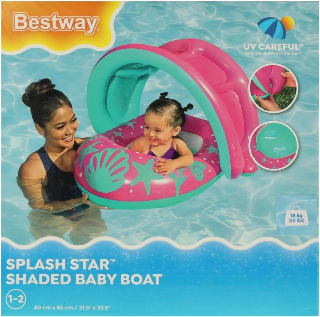 Rožinė–mėlyna vaikiška plaukiojimo kėdutė su stogeliu puikiai tinka mažyliams, pradedantiems pažintį su vandeniu. Pripučiama stogelio dalis suteikia šešėlį ir padeda apsaugoti jautrią odą nuo saulės, o prireikus ją galima lengvai nuimti. Kojyčių angos ir formuota sėdynė suteikia stabilumo ir komforto, kad vaikas galėtų saugiai mėgautis vandens pramogomis.