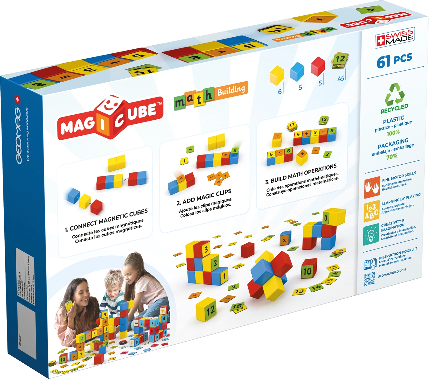 Geomag Magicube matematinis rinkinys jungia pramogą ir mokymąsi. Magnetiniai kubeliai traukiasi iš visų pusių, todėl vaikai lengvai stato formas, bokštus ir paprastas 3D konstrukcijas bei kartu treniruojasi skaičiuoti. Dėl dvisidžių segčių su skaičiais ir simboliais žaismingai lavinama sudėtis, atimtis ir daugyba.