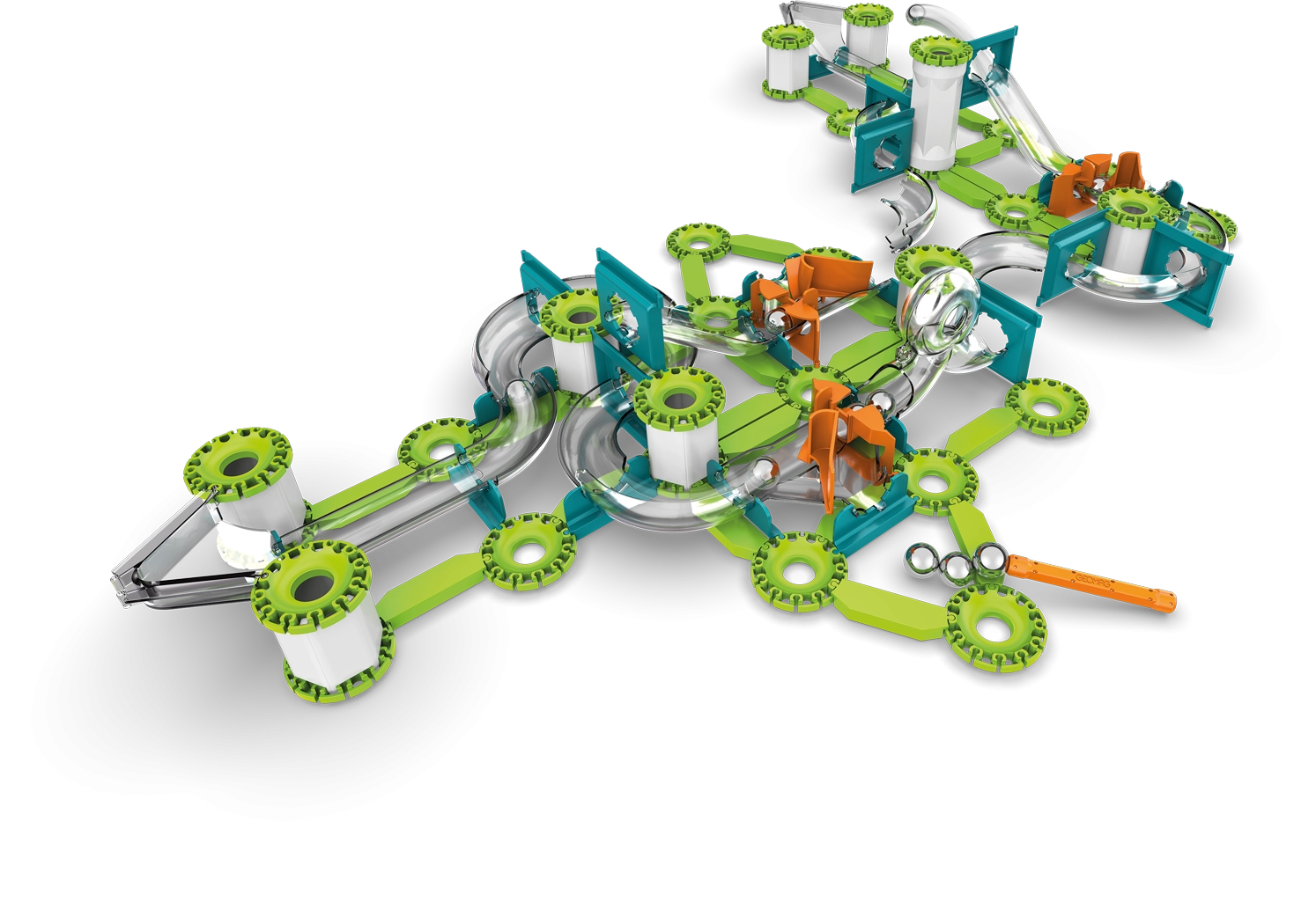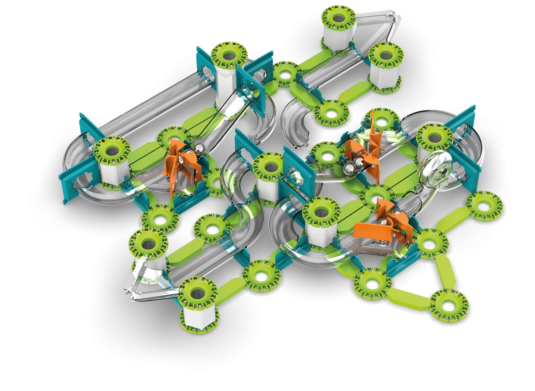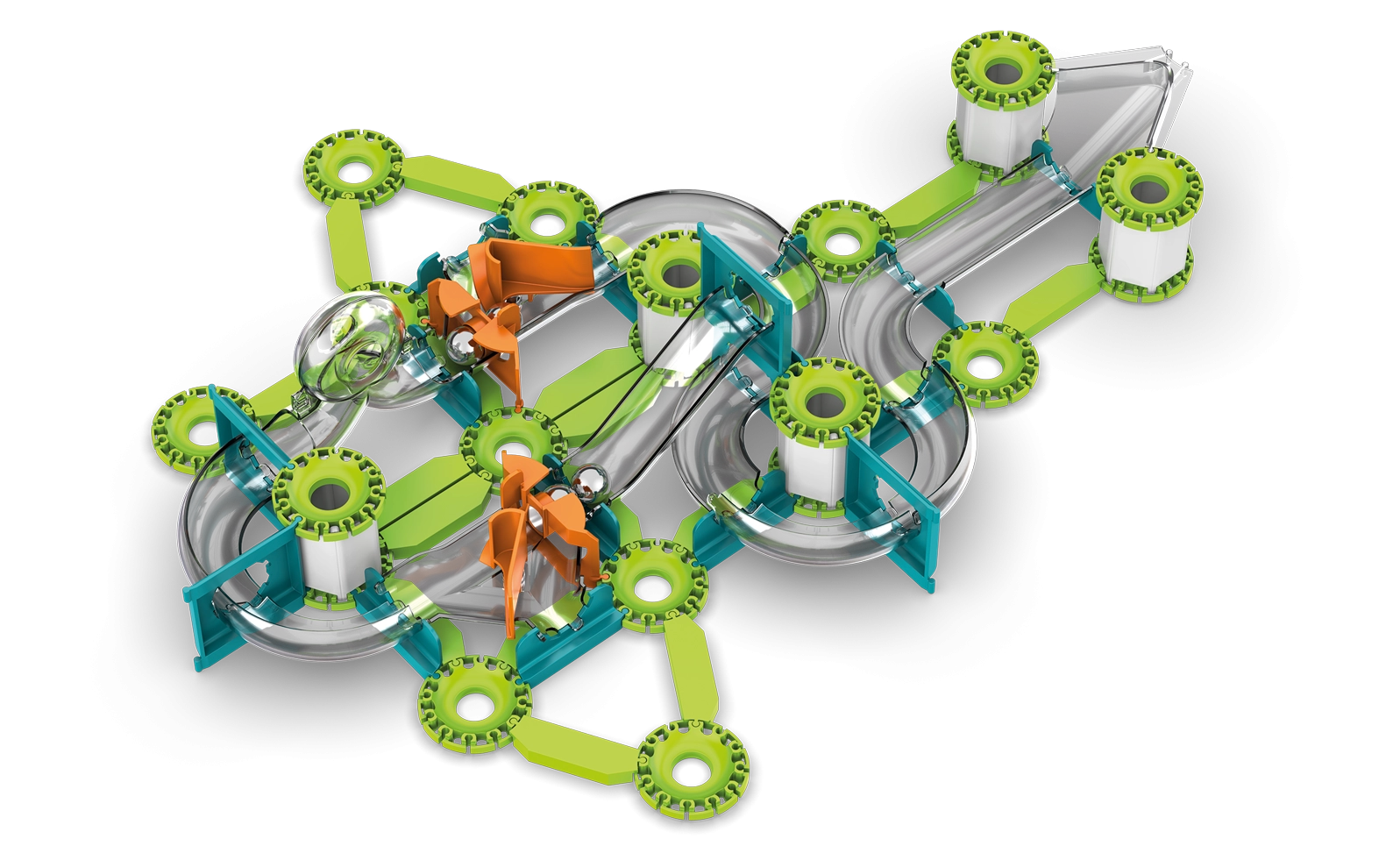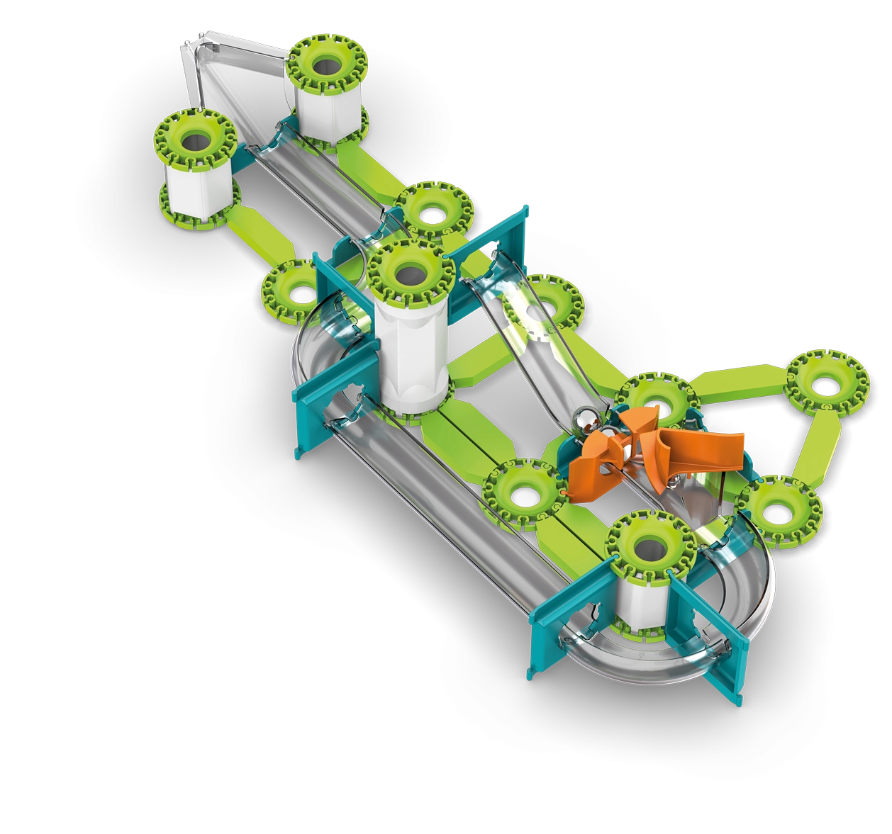- 153 detalės, įskaitant 12 metalinių rutuliukų, 116 konstrukcinių blokų ir 25 trasos elementus.