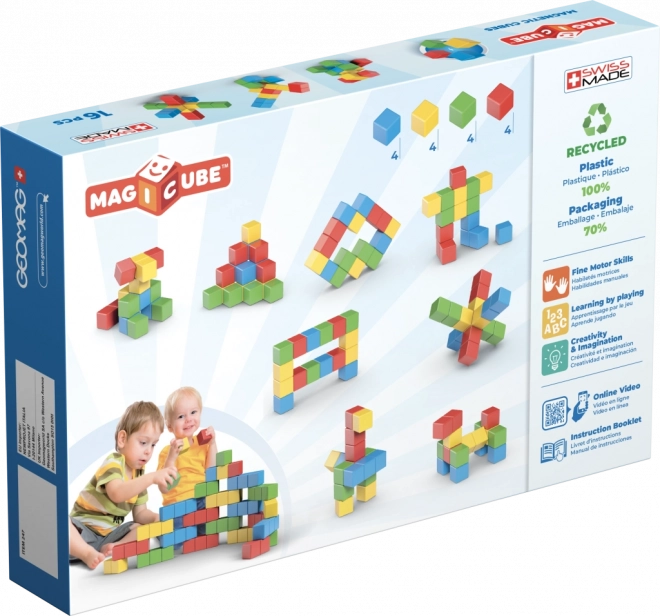 Statyba yra saugi, smagi ir be ekranų. Kubeliai patvarūs, malonūs laikyti rankoje ir dėl magnetų tvirtai laikosi kartu. 16 dalių rinkinys – puiki pradžia magnetinių konstruktorių pasaulyje, jį lengva plėsti su kitais GEOMAG rinkiniais.