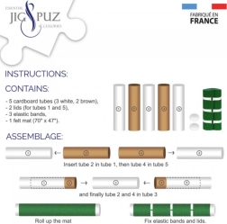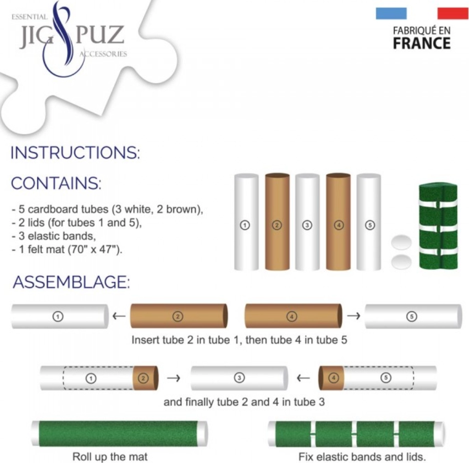 Į komplektą įeina viskas, ko reikia: kartoniniai vamzdeliai tvirtam branduoliui, veltinio kilimėlis 180 × 120 cm, plastikiniai dangteliai ir tvirtinimo dirželiai. Dėl didelio dydžio kilimėlis suteikia daug vietos ir patogiam detalių rūšiavimui pagal formas ir spalvas, kas spartina ir malonina dėliojimą.