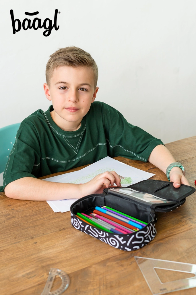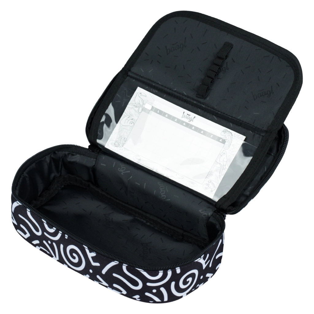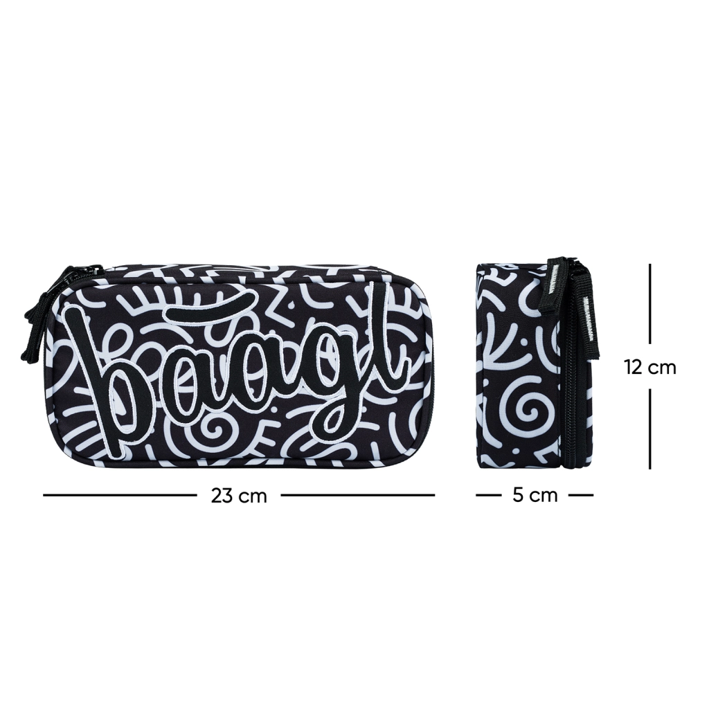 Penalas pasižymi juodai baltu tekstiliniu dizainu su abstrakčiais raštais ir užrašu „Baagl“. Jo stilingas dizainas tobulas tiems, kurie rūpinasi mada net ir mokyklinėse priemonėse.
