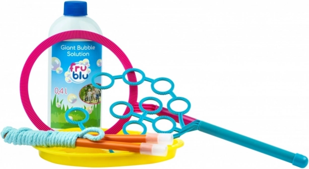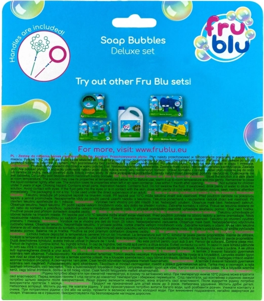 Prabangi FRU BLU burbulų rinkinio versija su 0,4 l tirpalu siūlo kompaktišką, lengvai sandėliuojamą sprendimą tiek mažiems, tiek milžiniškiems burbulams kurti. Dėl lengvo surinkimo, 3 keičiamų antgalių ir pridėto 0,4 l tirpalo vaikai ir suaugusieji mėgausis maksimaliu lauko pramogų kiekiu per šventes ir kasdien.