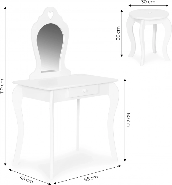 Sukurkite vaikams jų pačių grožio kampelį. Šis baltas tualetinis staliukas su širdelės formos veidrodžiu puikiai tiks bet kuriame vaikų kambaryje. Patvari ir stabili konstrukcija iš medžio ir MDF užtikrina ilgą tarnavimą, o lygūs paviršiai lengvai prižiūrimi.