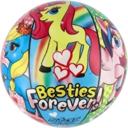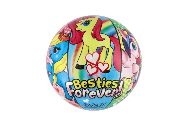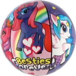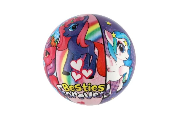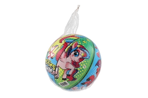 Kamuolys puoštas spalvingais ponių atvaizdais, kurie traukia dėmesį ir suteikia džiaugsmo kiekvienam žaidimui.