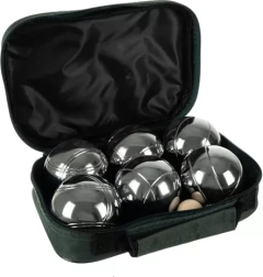 - 6 chromuoti metaliniai kamuoliai, 1 medinis mažutis (košonkas), matavimo virvelė, nailoninis dėklas