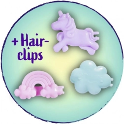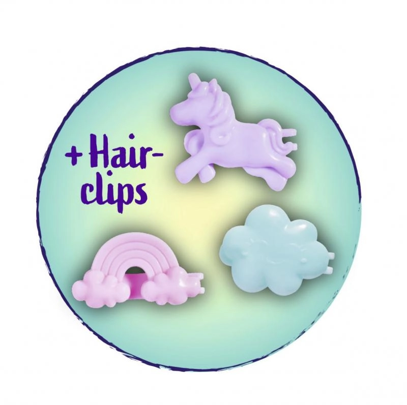 Evi turi ilgus rožinius plaukus ir spalvotas segtukų figūrėles debesėlio, vaivorykštės ir vienaragio formų – begaliniams šukuosenų eksperimentams.
