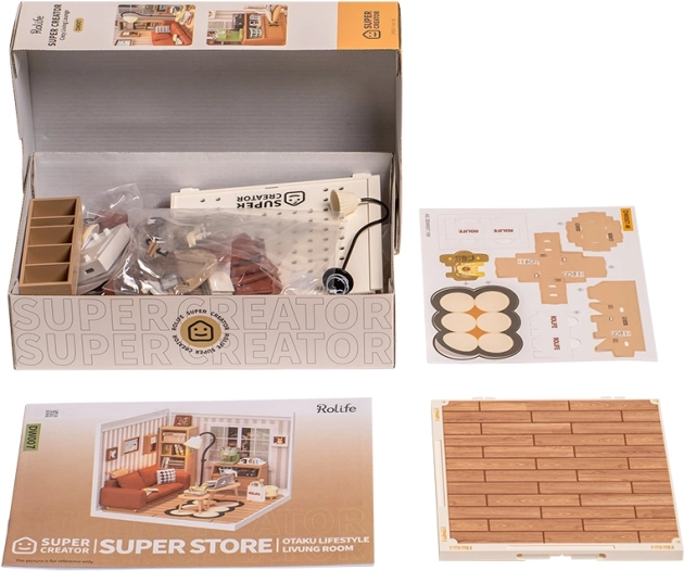 Susikurkite savo jaukumo kampelį su detalia miniatiūrų konstravimo rinkiniu iš prekės ženklo ROLIFE. Ši jauki svetainė prislopintų kavos atspalvių tonais siūlo LED apšvietimą, paslėptą knygų lentyną ir daugybę smulkių aksesuarų, kurie pradžiugins kiekvieną dizaino, kūrybos ir dekoracijų mylėtoją. Idealu kaip dekoracija, dovana ir atpalaiduojantis projektas vaikams nuo 8 metų ir suaugusiesiems.