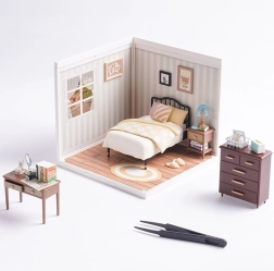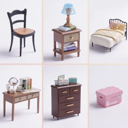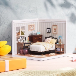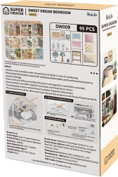 Atraskite miniatiūrų žavesį su miegamuoju Sweet Dream, kur natūralūs medžio tonai ir kreminiai geltoni akcentai kuria šiltą atmosferą. Rinkinyje rasite lovą, naktinį staliuką su lempa, darbo stalą su pasukamu veidrodėliu, komodą ir smulkias dekoracijas. Dėl LED apšvietimo išryškėja visos detalės, o modelis tampa įspūdinga dekoracija.