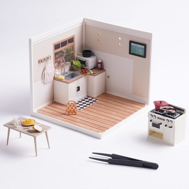 Atraskite detalių miniatiūrų ROBOTIME pasaulį ir sukurkite jaukią virtuvėlę prislopintų spalvų tonais. Modelyje yra viryklė, spintelės, valgomojo baldai ir smulkūs aksesuarai, kurie atrodo natūraliai ir autentiškai. Dėl LED apšvietimo išryškėja kiekviena detalė, o jūsų kūrinys taps lentynos ar darbo stalo puošmena.