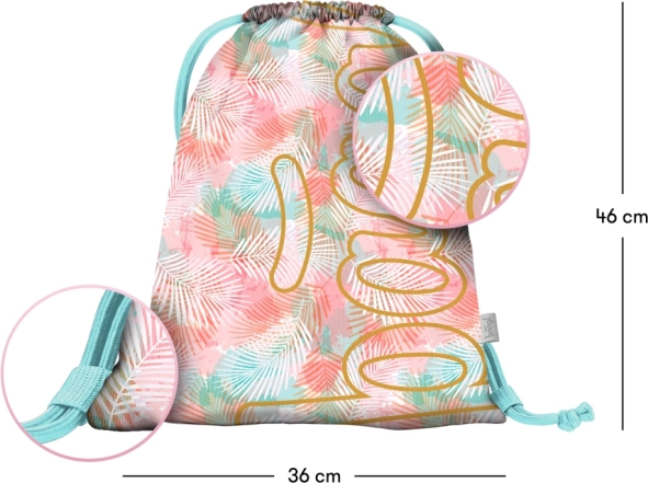 Lengvas ir patvarus BAAGL Sunset maišelis su tropiniu raštu rožinės ir mėlynos spalvų tonais – puikus pasirinkimas mokyklai, treniruotėms ir kelionėms. Dėl plaunamo paviršiaus lengvai prižiūrimas ir ilgai atrodo kaip naujas. Malonios, tvirtos virvelės atlieka ir pečių diržų, ir užsegimo funkciją.