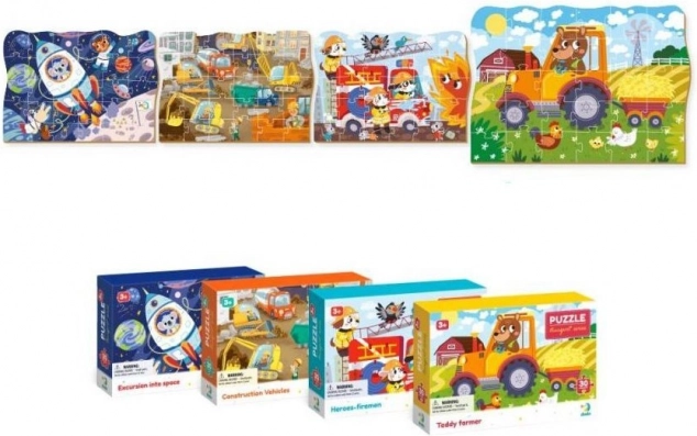 TRANSPORTO serijos DODO dėlionės siūlo nuostabias transporto priemonių iliustracijas. Ši konkreti dėlionė vaizduoja statybines mašinas ir gali būti sujungiama su kitomis scenomis, tokiomis kaip ferma, kosmosas ar priešgaisrinė gelbėjimo tarnyba.