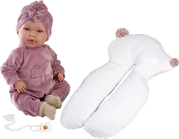 Pridėti keturių dalių drabužėliai, minkšta pagalvėlė ir žindukas su segtuku kūdikėliui nuraminti.