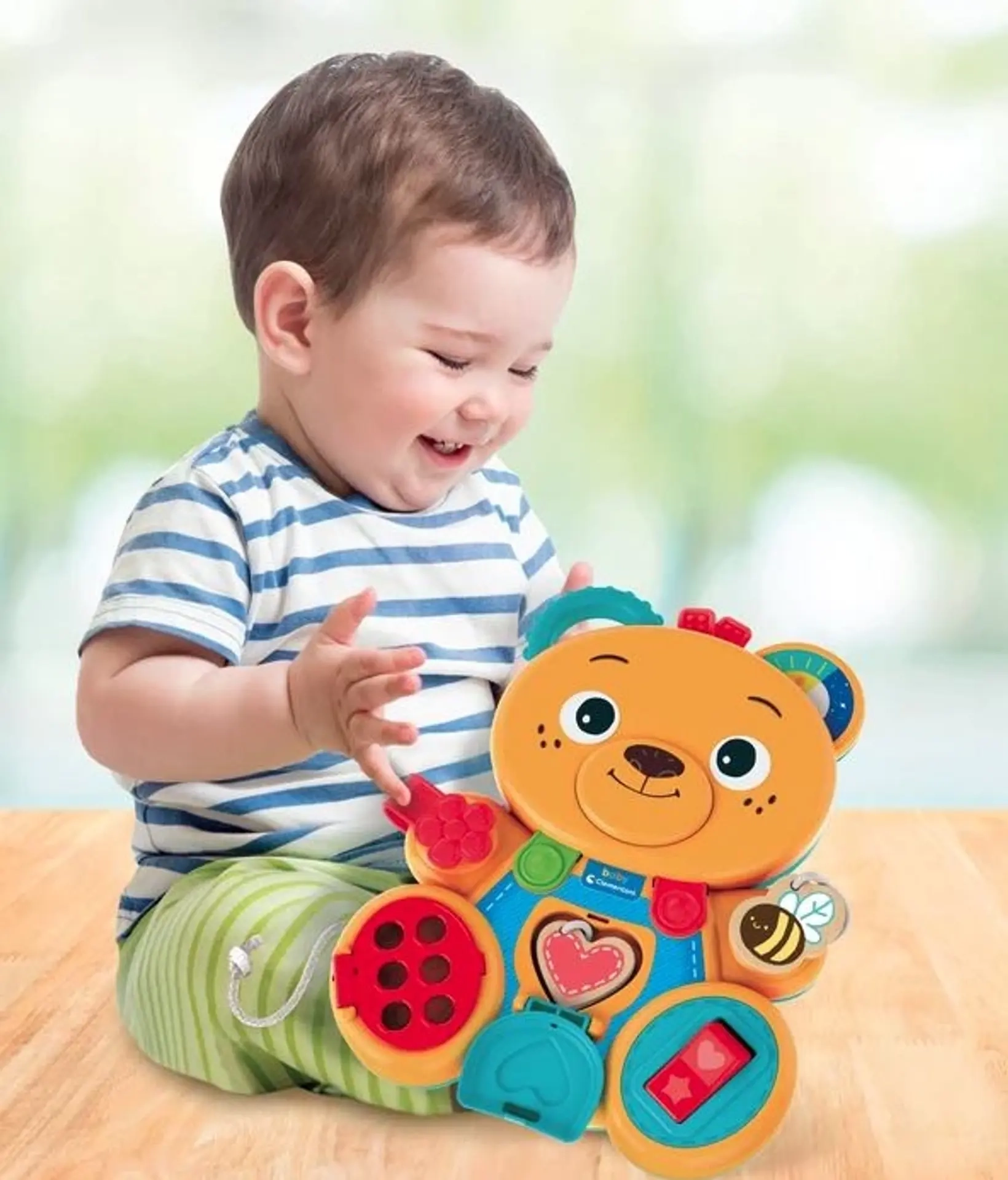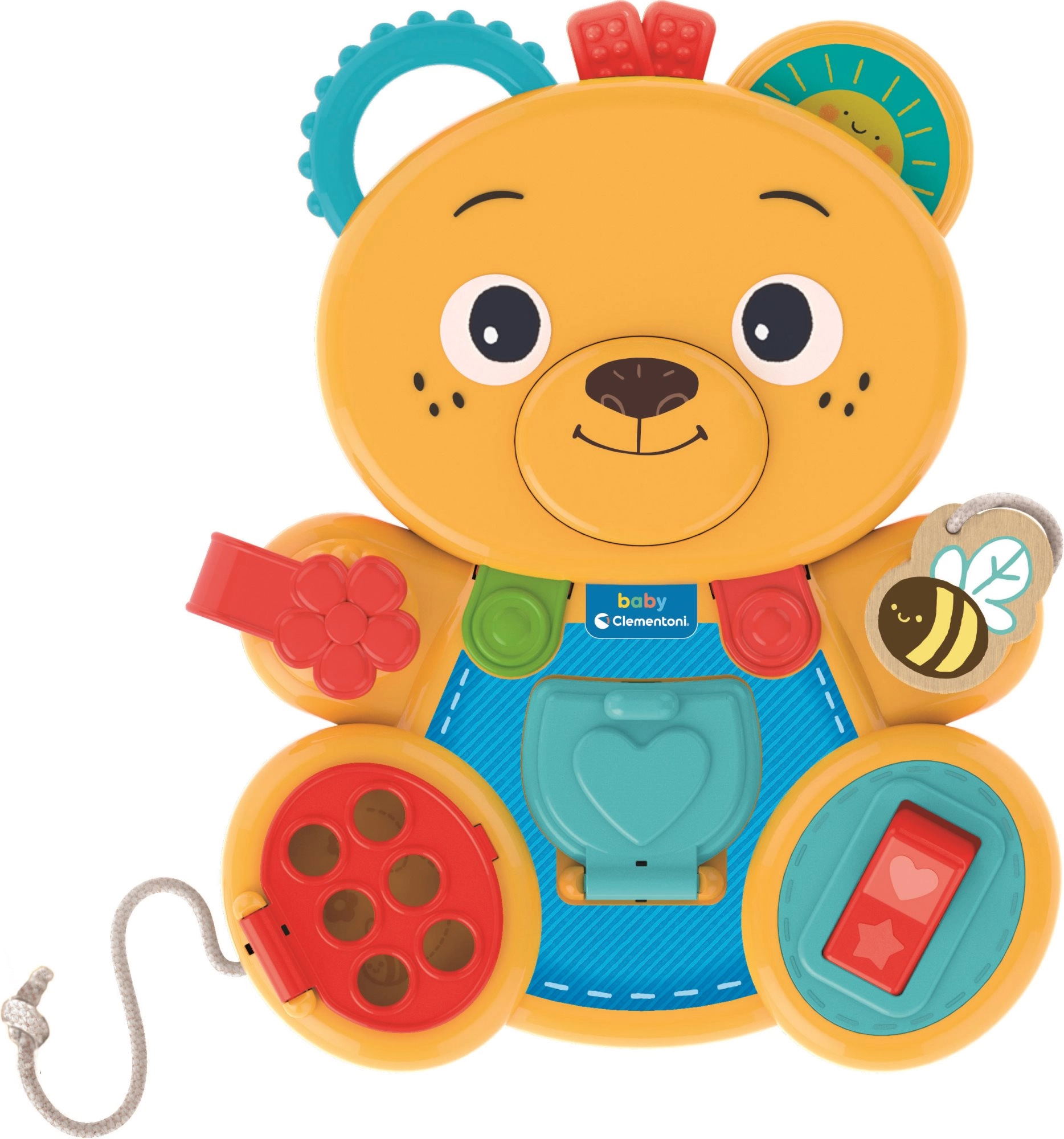 Linksmas ir spalvingas CLEMENTONI meškiukas padeda vaikams nuo 12 mėn. lavinti smulkiąją motoriką, susikaupimą ir jutiminį suvokimą. Sukurtas pagal Montessori metodiką ir siūlo daugybę veiklų, tokių kaip perveriami žiedai su virvele, spragtelintis jungiklis, įdedama širdelė, atidaromos durelės ir sukama ausytė. Derina minkštus ir kietus elementus, įskaitant medines detales, kad lavinimas būtų įvairus ir saugus.