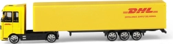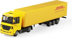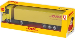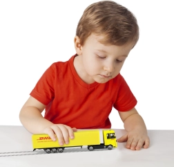 DHL vilkikas su priekaba yra idealus visiems vaikams, norintiems žaisti pristatymo paslaugas. Šis 1:87 mastelio modelis pagamintas iš metalo ir PVC derinio, kas užtikrina ilgaamžiškumą ir atsparumą žaidžiant. Dėl laisvos eigos vaikai gali mėgautis valandomis pramogų be baterijų. Modelis pažymėtas ryškiu DHL logotipu, todėl ši transporto priemonė yra ištikimas tikrų pristatymo automobilių atitikmuo.