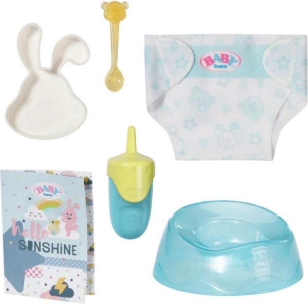 Rinkinyje yra buteliukas, čiulptukas, čiulptuko juostelė, sauskelnės ir kiti priedai pilnavertei priežiūrai ir žaidimui.