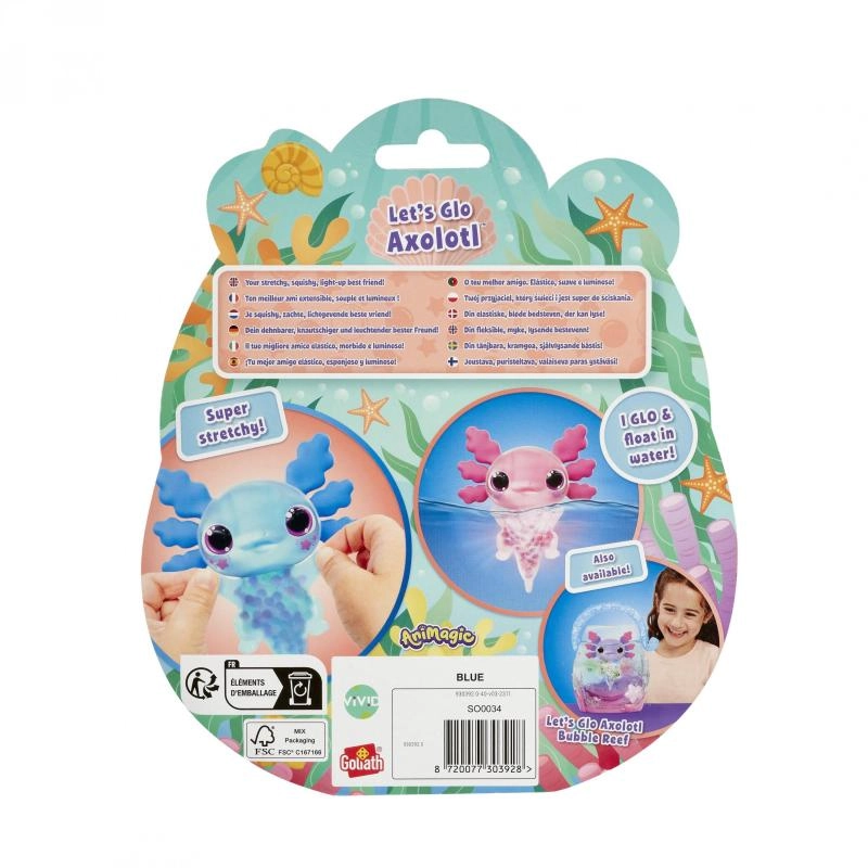 Rožinis šviečiantis aksolotlis ANIMAGIC paverčia maudynes spalvingu reginiu. Susilietęs su vandeniu jis šviečia švelnia šviesa, kuri sudomina vaikus ir skatina jų vaizduotę. Dėl minkšto ir elastingo korpuso žaislą malonu spaudyti ir laikyti, todėl jis skatina smulkiosios motorikos bei jutiminio suvokimo raidą.