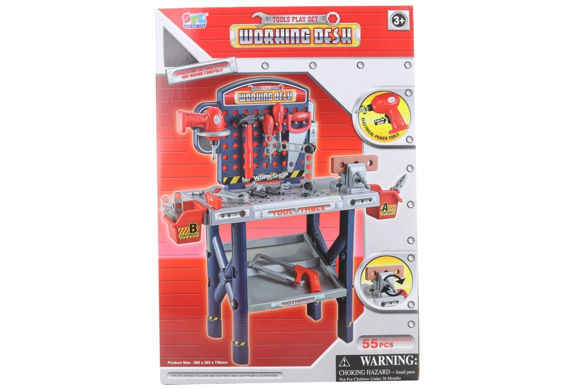 Pristatome vaikišką darbo stalą, idealiai tinkantį nuo 3 metų vaikams, kurie mėgsta kurti ir taisyti. Šis tvirtas plastikinis stalas siūlo viską, ko reikia mažiesiems meistrams: