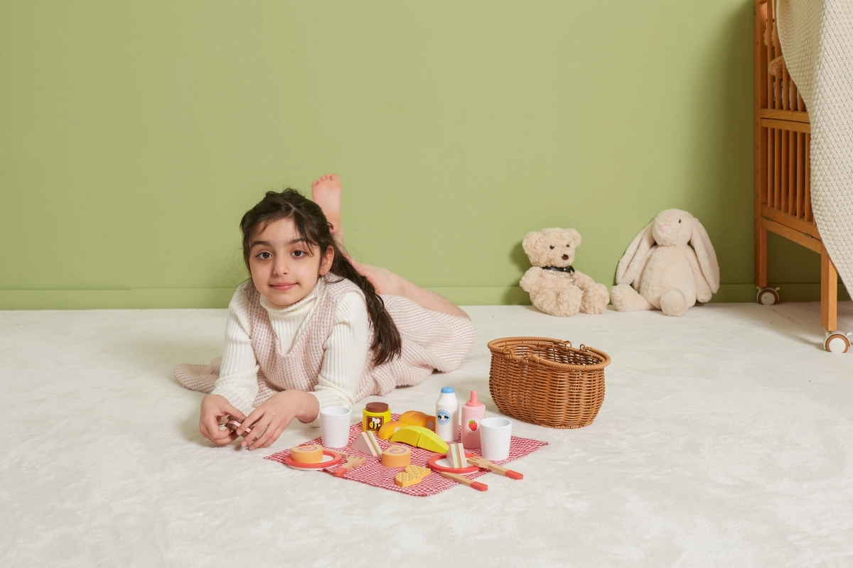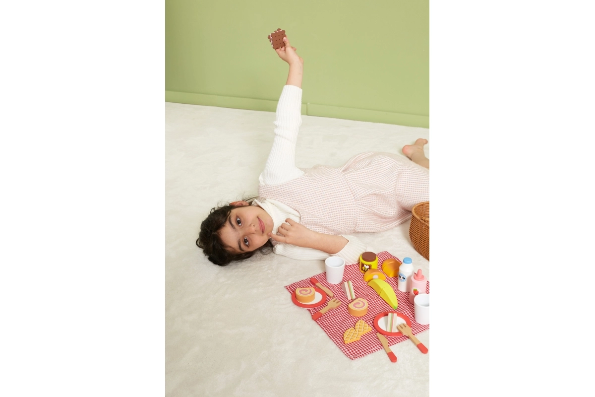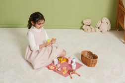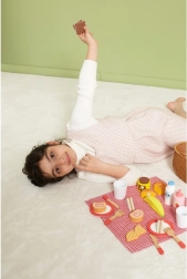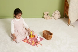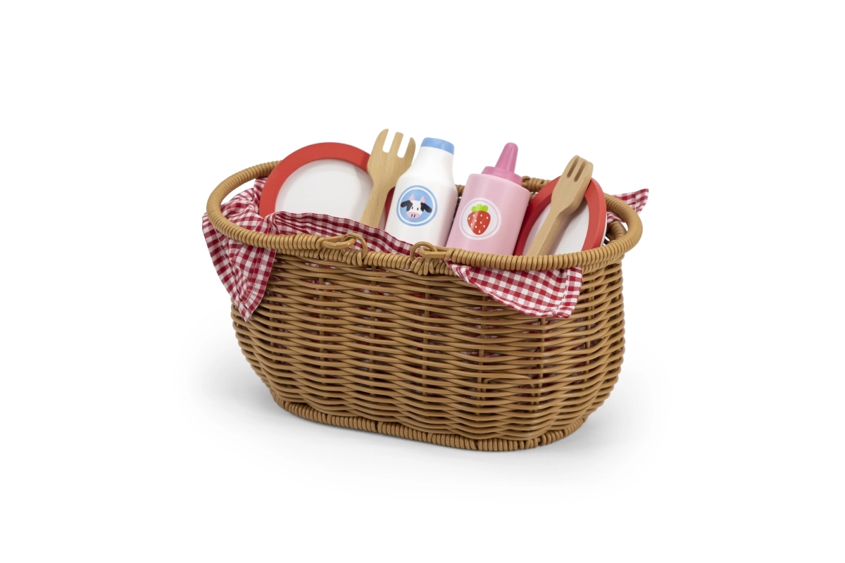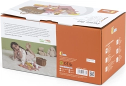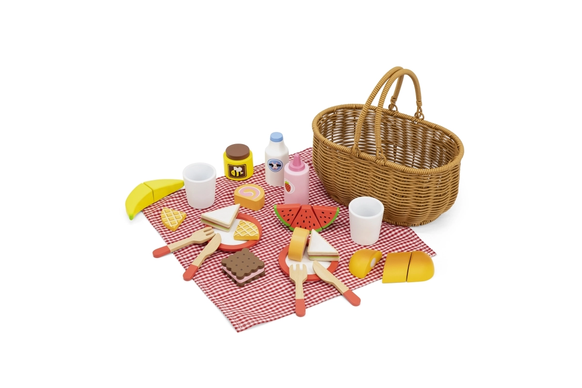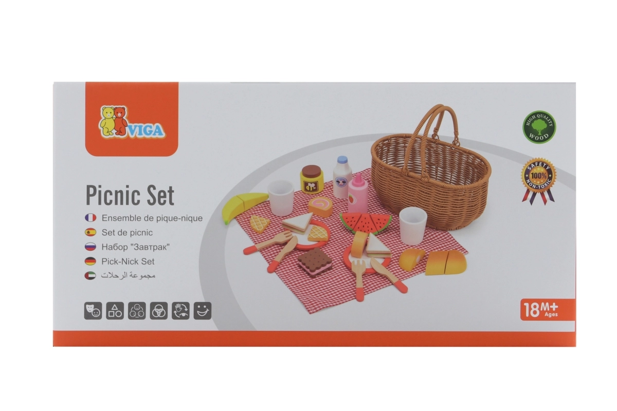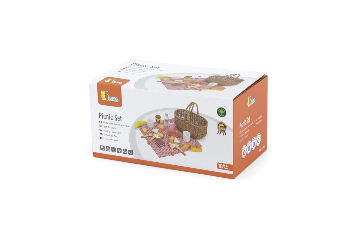 Vaikiškas pikniko rinkinys VIGA suteikia viską, ko mažiesiems virėjams reikia tobulam piknikui. Tvirtas „pintos“ nendrės imitacijos krepšelis yra lengvas nešti, viduje rasite indus, įrankius, gėrimus ir spalvingą medinių skanumynų pasirinkimą. Dalis produktų suskaidoma į dalis ir sujungiama lipuku, tad vaikai gali saugiai išbandyti pjaustymą ir serviravimą.