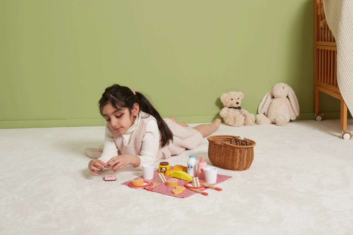 Išskiriamas maistas su lipuku ir medinis peilis moko vaikus koordinacijos, tikslumo ir logikos ruošiant patiekalus.