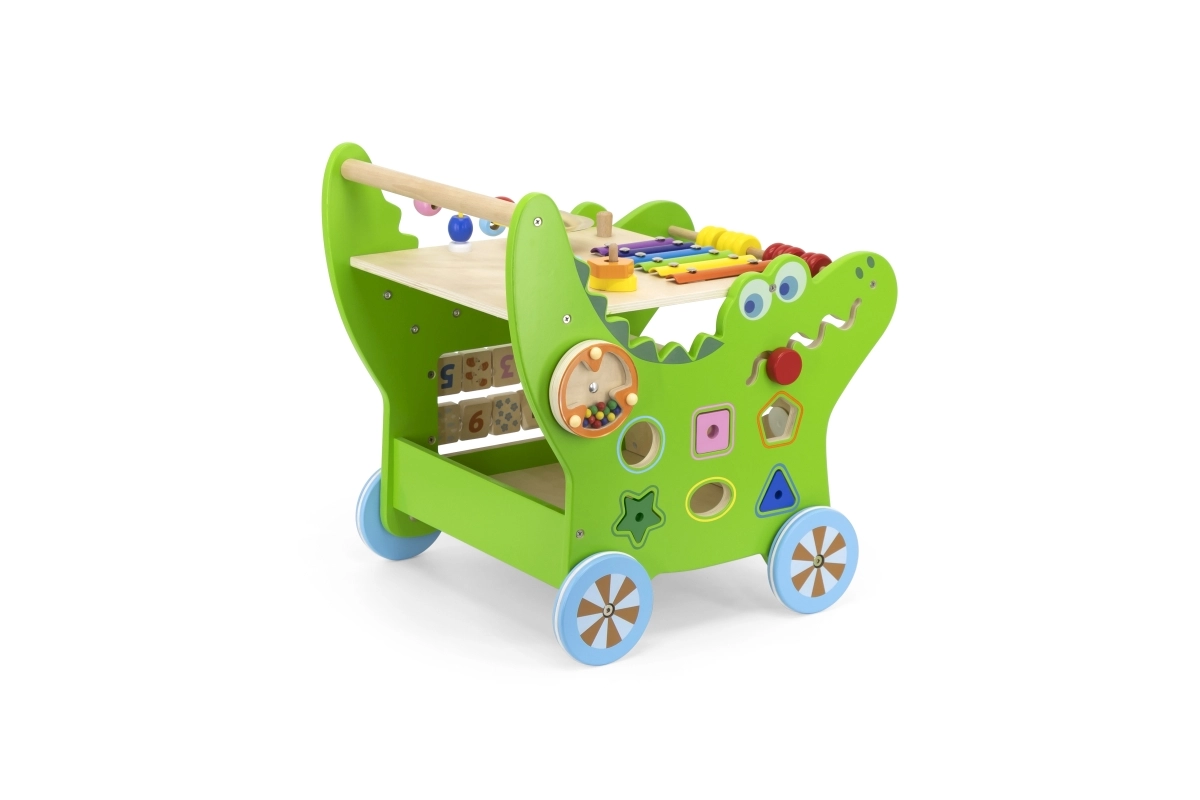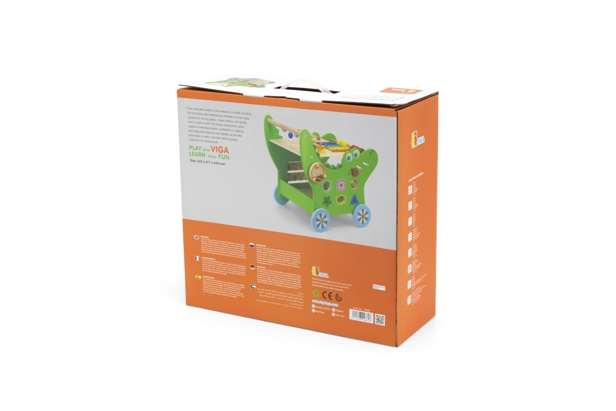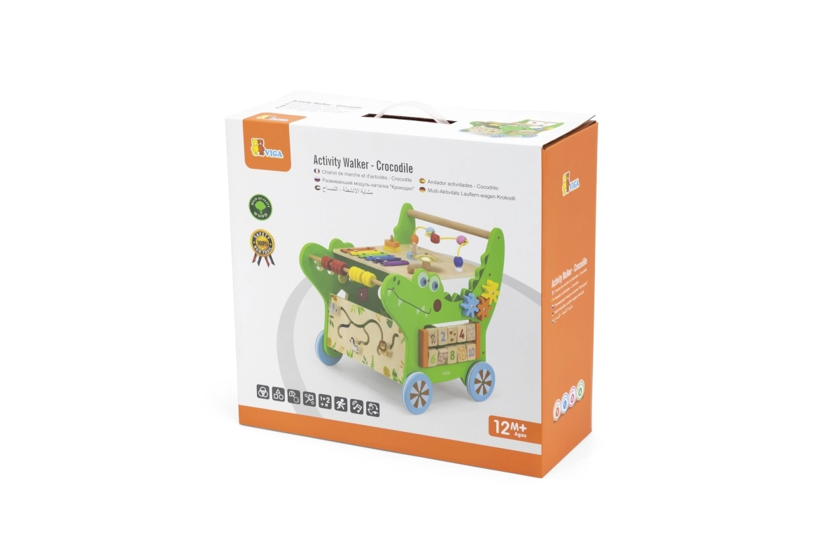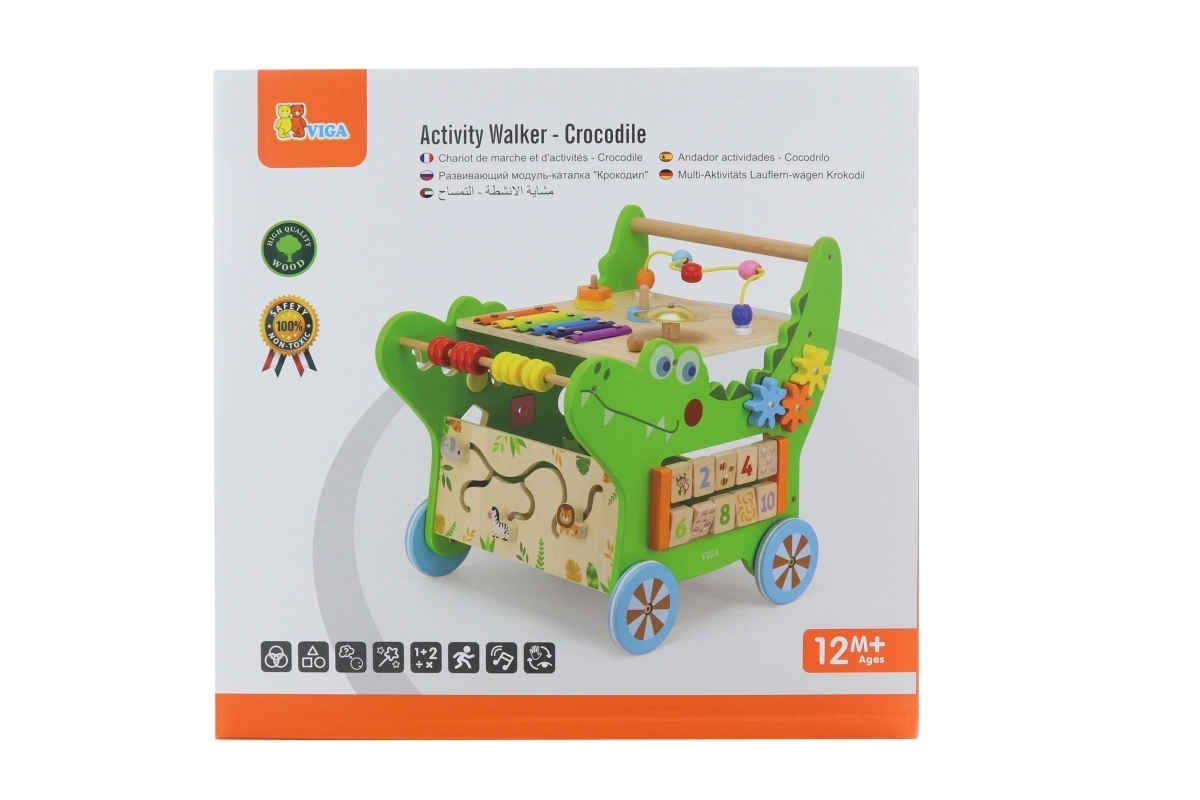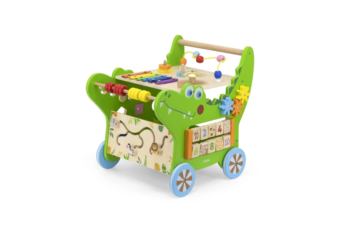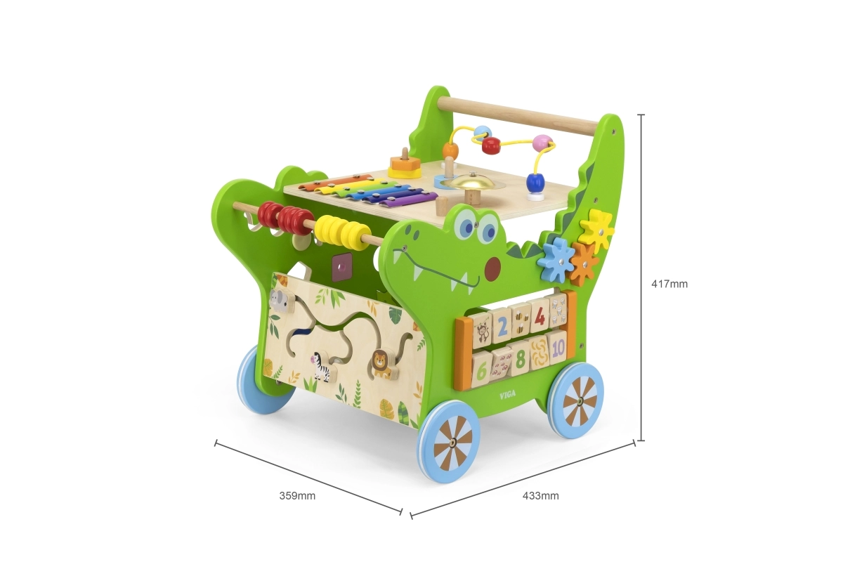 Atraskite daugiafunkcę medinę krokodilo formos vaikštynę iš VIGA, siūlančią net 12 veiklų pramogai ir mokymuisi. Ji padeda žengti pirmuosius žingsnius, lavina smulkiąją ir stambiąją motoriką, rankos–akies koordinaciją ir loginį mąstymą. Ant jos rasite ksilofoną, skaitliuką, formų rūšiavimo dėžutę, krumpliaračius, labirintą ir kitus elementus, kurie motyvuoja vaikus judėti ir tyrinėti.