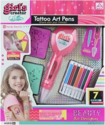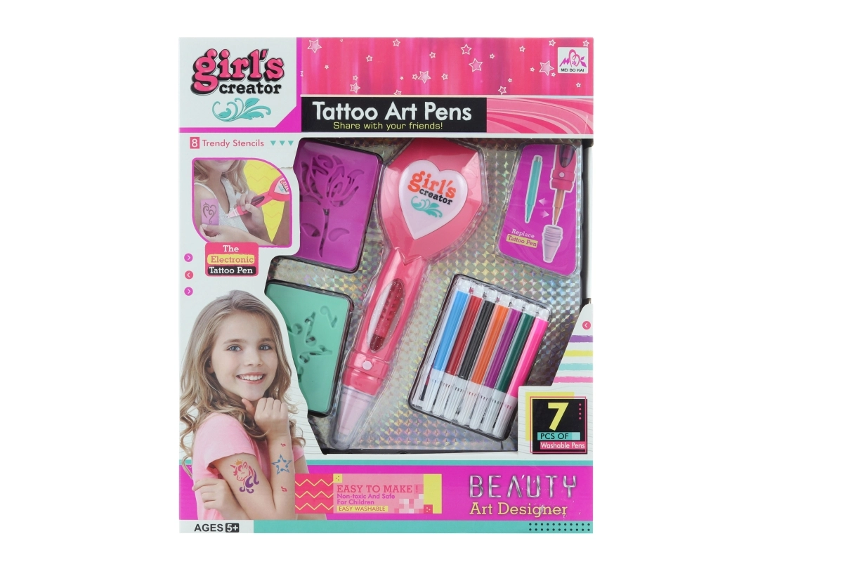 Su šiuo smagiu tatuiruočių rinkiniu vaikai lengvai sukurs stilingas laikinas tatuiruotes. Dėl elektrinio tatuiruočių rašiklio aplikavimas paprastas ir greitas, trafaretai padeda išgauti tikslias formas, o 7 spalvoti rašikliai praplečia kūrybos galimybes.