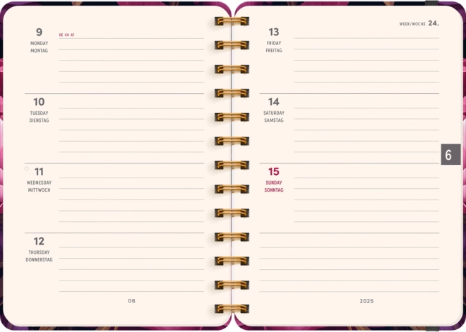 Dėl kompaktiškų 13 × 18 cm matmenų dienoraštis lengvai telpa į rankinę ar kuprinę, o spiralinis įrišimas leidžia patogiai visiškai atversti ir komfortiškai rašyti. 2024 ir 2025 metų apžvalgos bei pažymėtos šventinės dienos palengvina orientaciją ir planavimą.