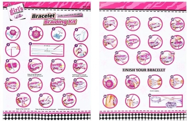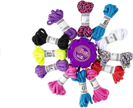 Rinkinyje yra 12 ryškiaspalvių siūlų, siūlo skersmuo – apie 0,5 cm. Kiekvieną jų galite naudoti apyrankėms ar kasoms pinti. Be to, pakuotėje rasite įrenginį, kuris palengvina pynimą ir apyrankių kūrimą.