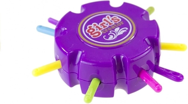 Rinkinyje yra apvalus įrenginys, kuris palengvina apyrankių pynimą ir padeda kurti sudėtingus raštus.