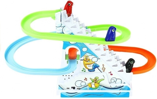 Pingvinai slysta taku, skambant linksmoms melodijoms, o tai suteikia mažyliams valandų džiaugsmo ir pramogų.