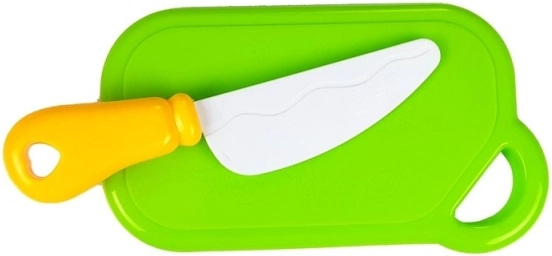 Saugus plastikinis peilis ir pjaustymo lentelė leidžia mėgdžioti tikrą gaminimą be susižeidimo rizikos. Idealu pirmiesiems kulinariniams bandymams.