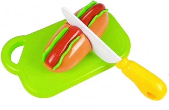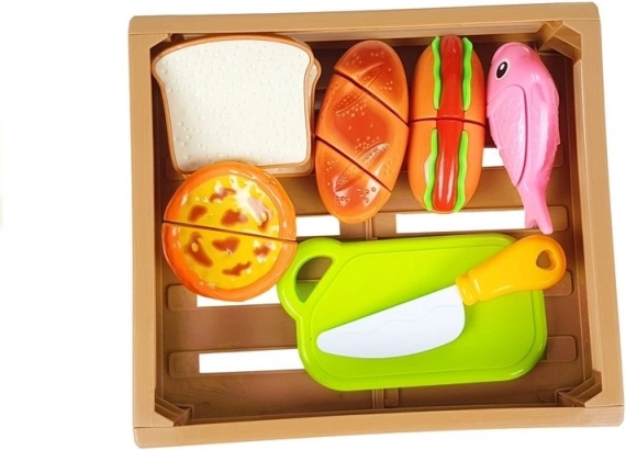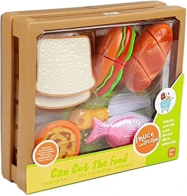 Atraskite smagų gaminimo pasaulį su vaikišku maisto rinkiniu, kuriame kiekvienas gabalėlis sujungtas lipukais. Vaikai gali paruošti dešrainį, patiekti žuvį, supjaustyti kepinius arba „iškepti“ kapkejį. Saugus plastikinis peilis ir lentelė leidžia tikroviškai, bet visiškai saugiai pjaustyti.