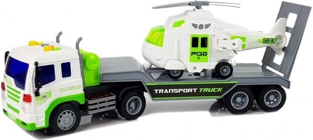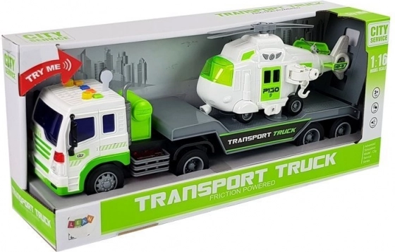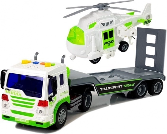 Šis detaliai apdirbtas transportinis vilkikas baltai–žalia spalvų derinio turi ilgą platformą patogiam sraigtasparnio ar kitų transporto priemonių pakrovimui. Galinis nuleidžiamas trapas palengvina užvažiavimą ir saugų krovinio tvirtinimą. Pramogą kuria šviesos ir garso efektai – ant kabinos stogo rasite 4 mygtukus variklio startui, garsiniam signalui, važiavimo ir atbulinės eigos garsams. Dėl frikcinės pavaros pakanka automobilį patraukti atgal ir paleisti.