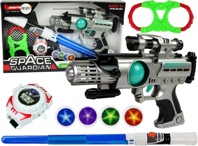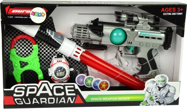 Kosminių ginklų rinkinys Space Guardian – tai pilnas komplektas visiems mažiesiems nuotykių ieškotojams. Jame yra ne tik lazerinis pistoletas, bet ir šviesos kardas, žaidimų stovyklos atributai ir diskų šaudyklis, užtikrinantys visapusišką žaidimo patirtį. Dėl šviesos ir garso efektų žaidimas su šiuo rinkiniu tampa įtraukiantis ir kūrybiškas.