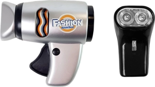 Paspaudus džiovintuvo rankeną, viduje ima suktis spalvotas būgnelis, o pastūmus mašinėlės šoninį mygtuką skamba autentiškas kirpimo garsas. Rinkinyje rasite viską – nuo šukų, veidrodėlio ir saugių žirklių iki trimerio, žaidiminės skustuvės bei buteliukų „kosmetikai“.