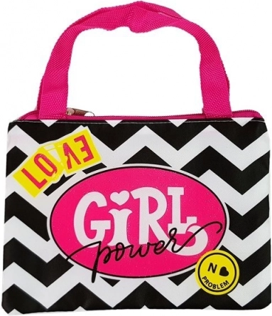 Mažas dėkliukas su juodai baltu zigzago raštu ir rožiniu užrašu „Girl Power“.