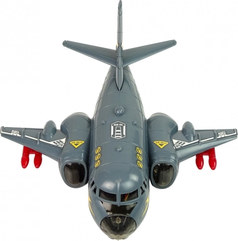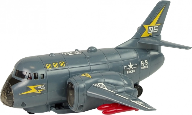 Šis interaktyvus bombonešis idealiai tinka kariuomenės ir aviacijos gerbėjams. Pilkas dizainas su raudonomis raketomis suteikia autentišką karinę išvaizdą. Žaislas pagamintas iš patvaraus plastiko ir turi spalvotus šviesos diodus, kurie šviečia fiuzeliaže ir sparnuose, kartu su realistiškais garso efektais, tokiais kaip variklio užvedimas ir šaudymas.
