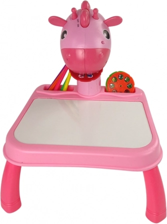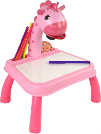 Projektuok, kopijuok ir kurk! Rožinis projekcinis staliukas su žirafa vaikams palengvina pirmuosius žingsnius piešime. Tereikia įdėti vieną iš trijų diskų (iš viso 24 paveikslėliai), įjungti šviesą ir sufokusuoti – kontūrai bus projektuojami ant paviršiaus, o vaikas lengvai juos apibrėš. Apšvietimą galima papildyti 12 linksmų melodijų, tad kūryba bus dar smagesnė.
