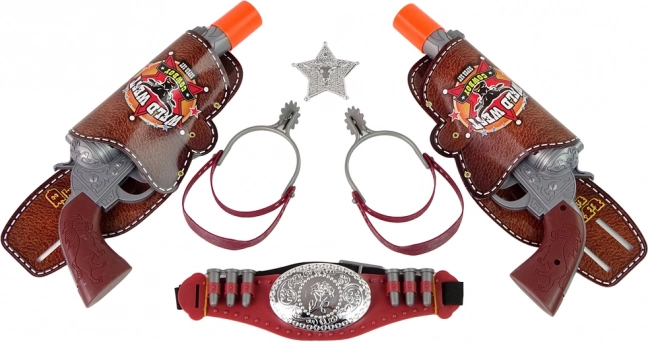 Diržas su dėklais, du revolveriai, šerifo žvaigždė ir antrankiai – viskas, ko vaikui reikia įtemptiems Laukinių Vakarų nuotykiams.