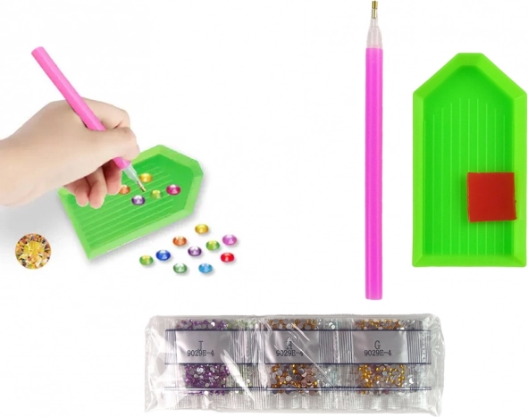 Rinkinį sudaro kristalų padėklas, taškinis pieštukas ir klijai tiksliam ir lengvam kristalų dėliojimui.