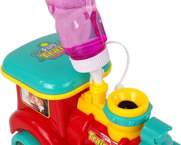 Komplekte yra burbulų tirpalas buteliuke, kurio dėka lokomotyvas kuria dešimtis spindinčių burbuliukų.