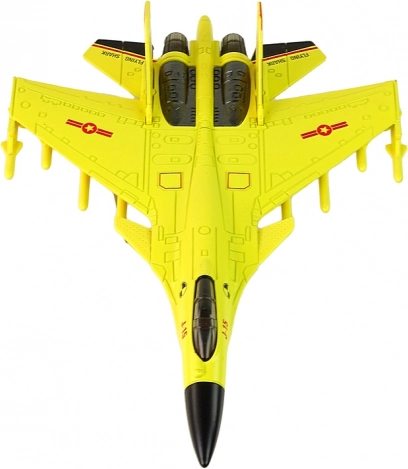 Elegantiškas geltonas dizainas: Lėktuvas pagamintas autentiškos geltonos spalvos, primenančios tikrą naikintuvą. Turi guminius ratukus sklandžiam judėjimui įvairiais paviršiais.