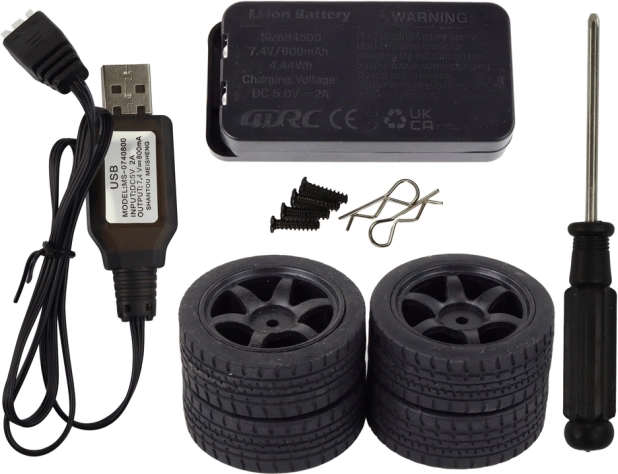 Patogus vairavimas su vairo tipo valdikliu ir droselio svirtimi, stabilus perdavimas be trukdžių ir praktiški priedai: USB įkroviklis, Li‑ion baterija, atsarginės padangos ir įrankiai.