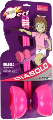 13,5 x 11,5 cm dydžio diabolo – tai išskirtinis linksmas žaislas, nukeliantis į žongliravimo pasaulį. Rinkinyje yra dvi tvirtos plastikinės lazdelės (26 cm) ir 110 cm ilgio virvelė, leidžianti atlikti itin įspūdingus triukus, tokius kaip metimai ir sukimasis aplink virvelę.