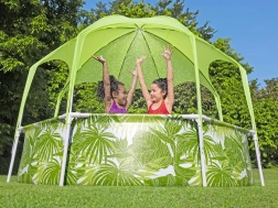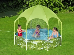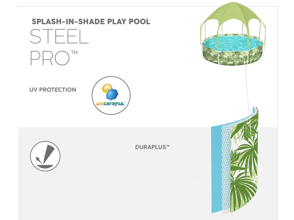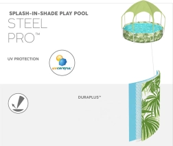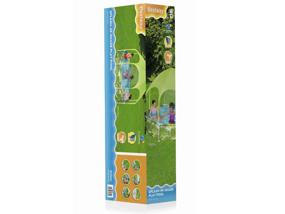 Bestway SPLASH-IN-SHADE baseinas sukurtas taip, kad skatintų vaikus judėti ir saugiai linksmintis vandenyje sode. Stogelis su integruotu purkštuku suteikia šešėlį ir vėsą; tereikia prijungti sodo žarną ir pramogos gali prasidėti. Spalvinga vasariška grafika pradžiugins mažuosius plaukikus, o tvirta konstrukcija užtikrins stabilumą visą vasarą.
