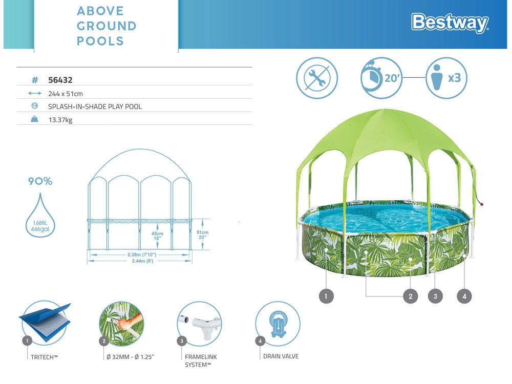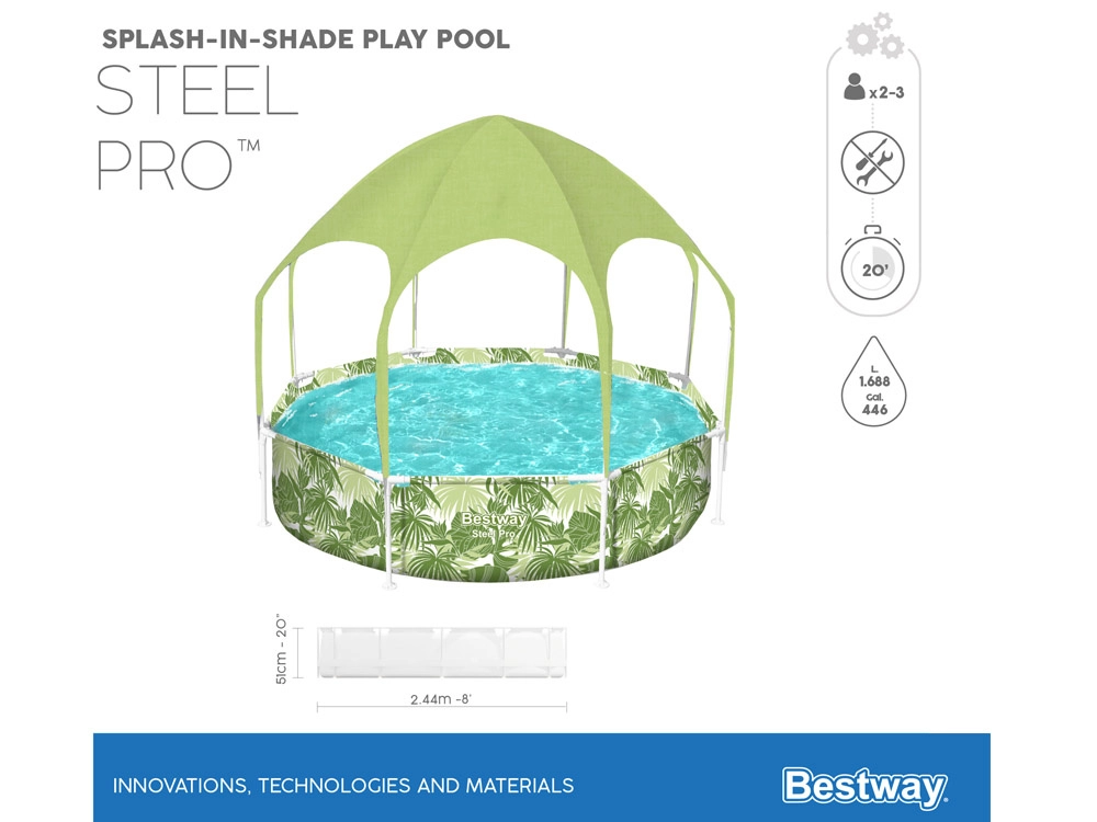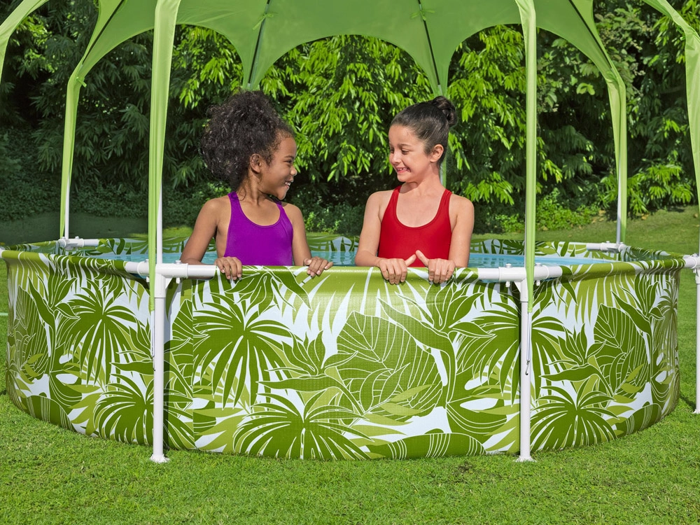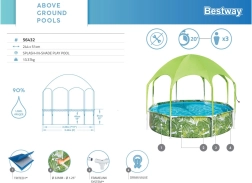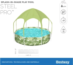 Mėgaukitės vasara su Bestway vaikų baseinu su metaline konstrukcija, kurio matmenys 244 × 51 cm, talpa 1688 l. Komplekte yra praktiškas stogelis su purkštuku, kuris užtikrina apsaugą nuo UV spinduliuotės ir gaivą karštomis dienomis. Atspari metalinė konstrukcija ir ClickConnect sistema leidžia greitai ir lengvai surinkti be įrankių, o išmani konstrukcija neleidžia metalui liestis su metalu ir didina atsparumą korozijai.