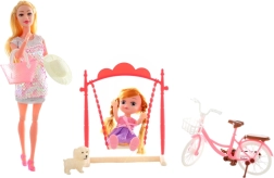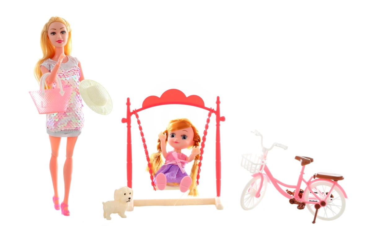 - Didelė 30 cm lėlė (sąnariuota), maža 16 cm lėlė, 33 cm automobilis, 30 cm motoroleris, 17 cm dviratis, sūpynės, šuniukas, skrybėlė, šalmas, pirkinių krepšys